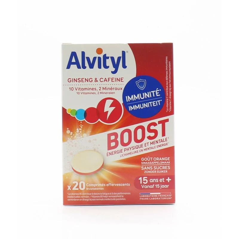 Описание Alvityl Ginseng & CaffeineAlvityl Ginseng & Caffeine — это пищевая добавка на основе: женьшеня, кофеина, витаминов B1, B2, B3, B5, B6, B8, B9, B12, витамина C, витамина E, цинка, магния. Alvityl Ginseng & Caffeine способствует повышению физической и умственной энергии. Рекомендуется в случае экзаменационного периода, переутомления или потери тонуса. В шипучей форме эта пищевая добавка имеет восхитительный апельсиновый вкус, без сахара. Каковы рекомендации по использованию Alvityl Ginseng & Caffeine? Принимайте по 1 таблетке в день, растворив в большом стакане воды объемом 250 мл.