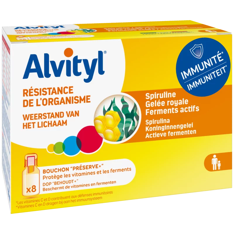 ОписаниеAlvityl Body Resistance — это пищевая добавка, которая дает толчок вашему организму в периоды сильной усталости (смена сезона, выздоровление, простуда, изменение темпа жизни и т. д.). Этот раствор с правильным вкусом персика содержит маточное молочко. , спирулина, активные ферменты и витамины. Эта пищевая добавка подходит для детей от 3 лет. Рекомендации по применению. С 3 лет принимать по флакону каждое утро. Взрослым принимать один флакон утром. Чтобы принять Alvityl Body Resistance, завинчивайте крышку по часовой стрелке до тех пор, пока пластиковая защита не сломается, и снимите ее. Продолжайте завинчивать, пока она не коснется бутылки. Как только порошкообразная часть окажется во флаконе, энергично встряхните. Отвинтите крышку и выпейте раствор. Для достижения оптимальных результатов рекомендуется пройти 8-дневный курс с возможностью продления при необходимости.СоставЖидкая фаза: очищенная вода; фруктоза; мед (ЕС); маточное молочко; экстракт спирулины (Spirulina piatensis); краситель натурального происхождения: карамель; консерванты: сорбат калия, бензоат натрия; подкислитель: лимонная кислота; персиковый аромат; подсластитель: сукралоза.