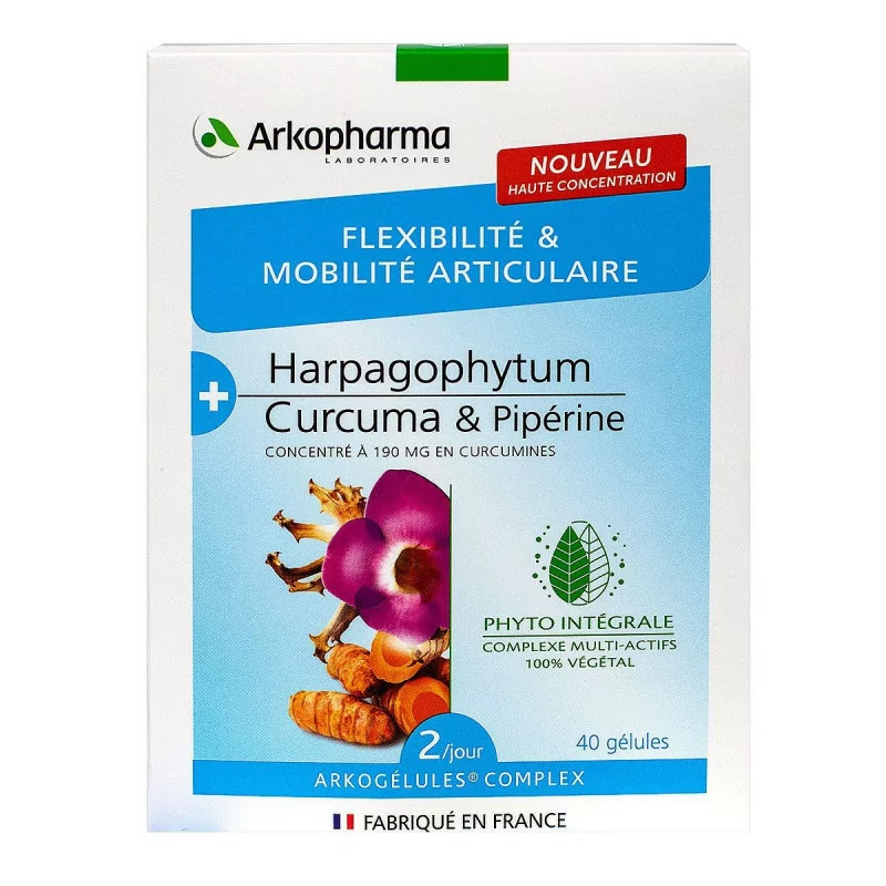 ОписаниеArkocapsules Complex Flexibility & Mobility от Arkopharma — это пищевая добавка, рекомендуемая людям, страдающим от дискомфорта в суставах. Комплекс Arkocapsules Flexibility & Mobility от Arkopharma, содержащий гарпагофитум и куркуму, рекомендуется для хорошего функционирования суставной системы путем укрепления гибкости и подвижности. Разработан и разработан. во Франции эта пищевая добавка имеет 100% растительный состав.Советы по применениюПринимайте 2 капсулы Arkocapsules Complex Flexibility & Mobility однократно утром во время еды, запивая большим стаканом воды.СоставПорошок клубней Harpagophytum (Harpagophytum) procumbens, Harpagophytum zeyheri) — Экстракт корневища куркумы (Curcuma longa) — Средство против слеживания: стеарат магния — Экстракт черного перца (Piper nigrum) — Рисовый концентрат (Oryza sativa). Конверт растительного происхождения: Гидроксипропилметилцеллюлоза. — Краситель растительного происхождения: медные комплексы хлорофиллинов.
