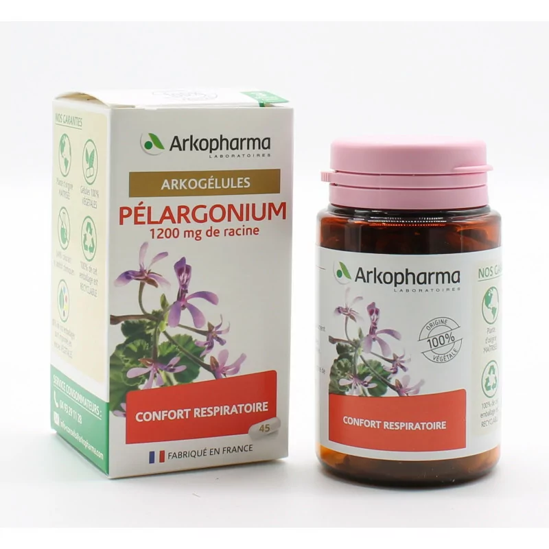 Порошок корня пеларгонии: 1200 мг Растительная оболочка: гидроксипропилметилцеллюлоза. Меры предосторожности при использовании. Принимайте пищевую добавку Pelargonium Arkocaps Arkopharma как часть разнообразной и сбалансированной диеты и здорового образа жизни.