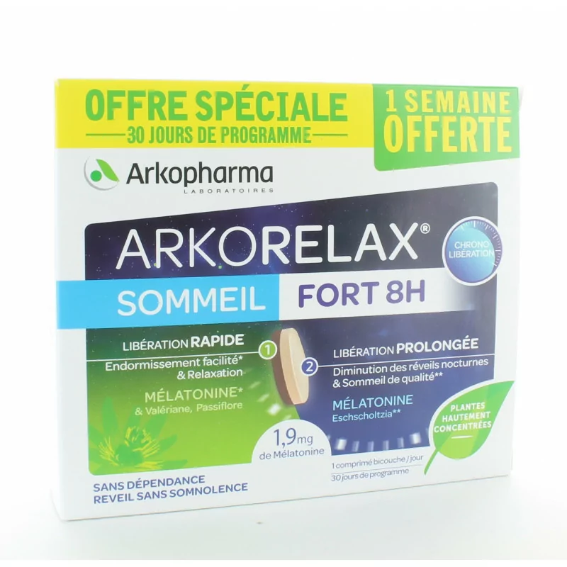 ОписаниеArkopharma Arkorelax Sommeil Fort 8H — это пищевая добавка на растительной основе, предназначенная для людей, страдающих нарушениями сна (трудности с засыпанием, ночные пробуждения, слишком короткие ночи и т. д.) благодаря высококонцентрированной инновационной формуле и двухслойным таблеткам Arkopharma Arkorelax Sommeil. Fort 8H обеспечивает двойное высвобождение мелатонина, быстрое и пролонгированное. Arkopharma Arkorelax Sommeil Fort 8H также содержит высокую концентрацию растений, признанных своими полезными свойствами для сна, таких как: — Пассифлора и валериана, быстро высвобождающиеся, способствующие расслаблению.