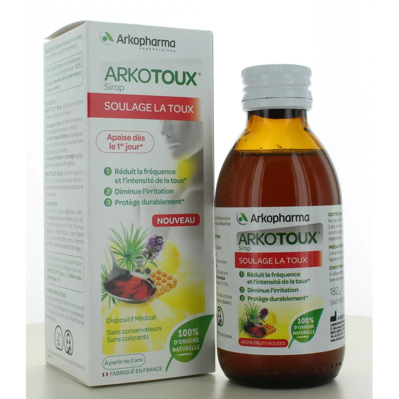 Описание: ArkoToux — это медицинское устройство в форме сиропа. Этот продукт специально разработан для облегчения кашля и успокоения дыхательных путей. Благодаря своим 100% натуральным оригинальным ингредиентам ArkoToux способствует отхаркиванию путем увлажнения слизи верхних дыхательных путей. ArkoToux также уменьшает раздражение, вызванное кашлем, благодаря своим пленкообразующим свойствам. Экстракт тимьяна ArkoToux защищает слизистые оболочки дыхательных путей благодаря своим антиоксидантным свойствам. Рекомендации по применениюДетям от 2 до 5 лет: 1 чайная ложка (5 мл), 1 раз в день.Детям от 2 до 6 лет: по 1 чайной ложке (5 мл) 2 раза в день.Взрослым и подросткам старше 12 лет: по 1 столовой ложке (10 мл) 2 раза в день.Сироп ArkoToux желательно принимать вместе. во время еды, соблюдая интервал не менее 4 часов между приемами.СоставГлицерин из растительных масел, мед, арабиногалактаны лиственницы (Larix sp.), экстракт листьев тимьяна (Thymus vulgaris L.), олигофруктоза, сироп агавы, вода, концентрированный лимон. сок, ксантановая камедь, натуральный ароматизатор красных фруктов. Меры предосторожности при примененииСироп ArkoToux является медицинским изделием. Внимательно прочтите инструкцию и/или посоветуйтесь со своим врачом или фармацевтом, прежде чем принимать какие-либо лекарства. Никогда не используйте сироп ArkoToux в следующих случаях: — У детей до 2 лет.