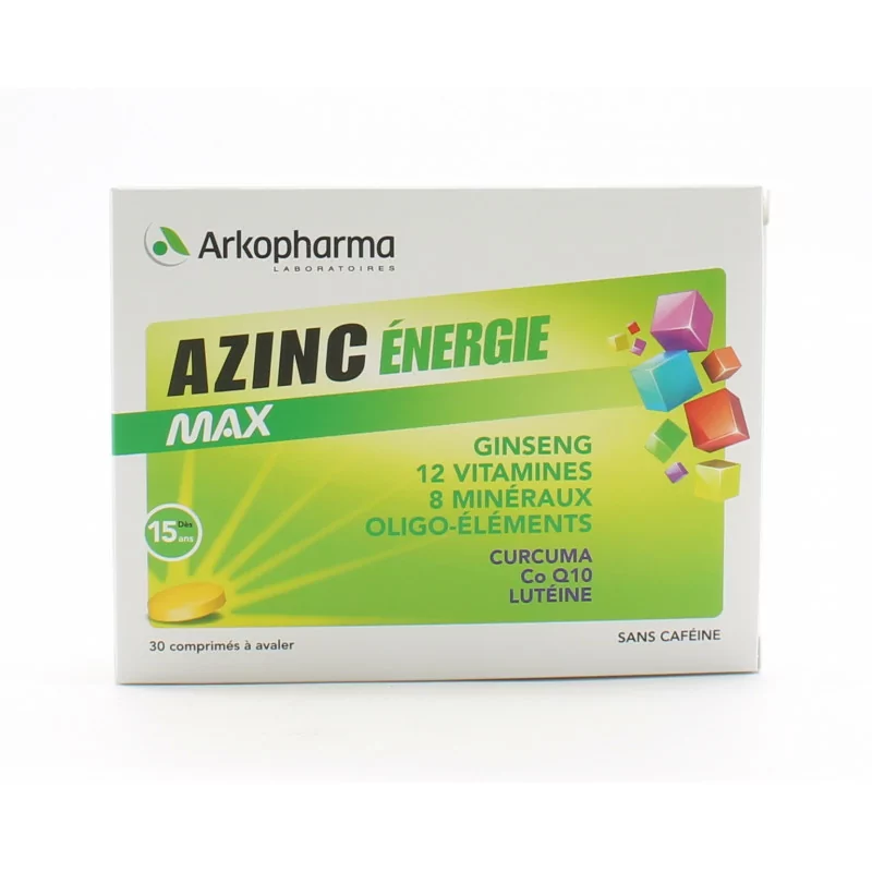 5 растительных экстрактов: женьшень, черника, календула (лютеин, зеаксантин), черный перец и куркума, коэнзим Q10 (Co Q10). Меры предосторожности при применении. Как и любую пищевую добавку, Arkopharma Azinc Energie Max следует принимать в составе разнообразных и диетических средств. сбалансированное питание и здоровый образ жизни. Не принимайте Arkopharma Azinc Energie Max, если у вас аллергия на один из его компонентов. Не превышайте рекомендуемую дозу. Не оставляйте Arkopharma Azinc Energie Max в пределах досягаемости и на виду у маленьких детей.