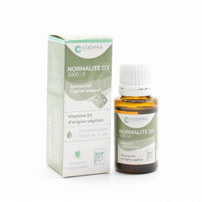 Описание: Codifra Normalité D3 2000Ul – пищевая добавка на основе витамина D растительного происхождения. Витамин D способствует нормальному функционированию иммунной системы. Он также способствует поддержанию нормальных костей, нормальному росту и развитию костей детей, а также нормальному усвоению и использованию кальция и фосфора.