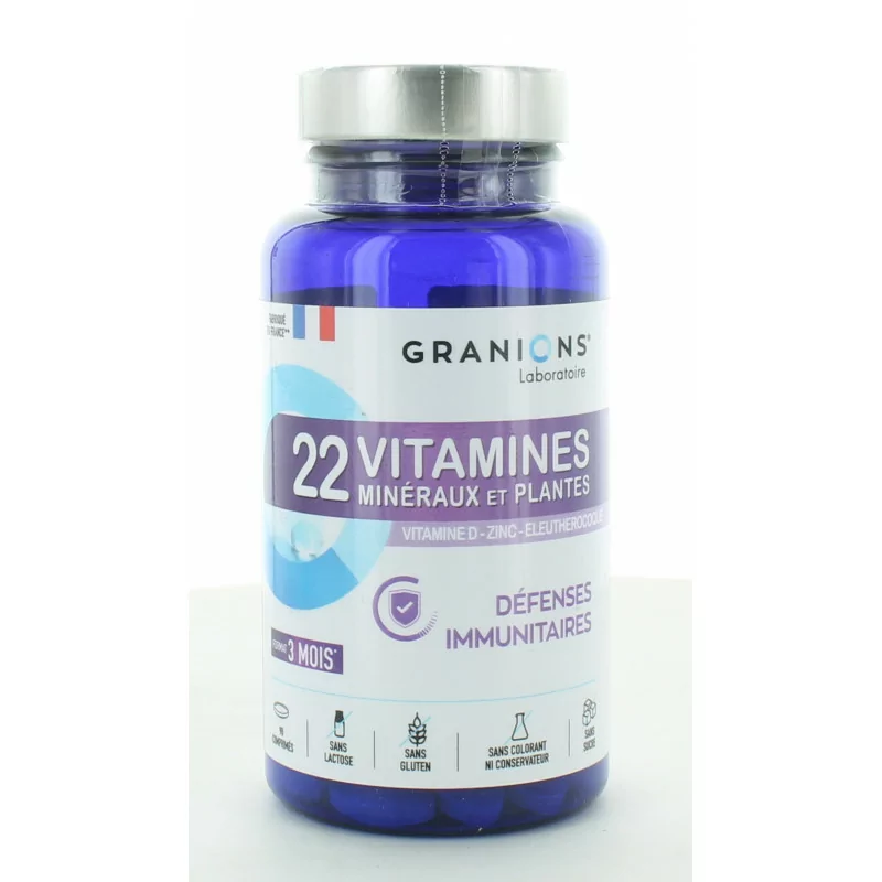 ОписаниеGranions 22 витамина Минералы и растения были разработаны для укрепления вашей иммунной защиты. Эта пищевая добавка содержит витамин D, цинк и элеутерококк. Усвоению активных ингредиентов этой пищевой добавки способствует экстракт черного перца. Способ применения. В фазе атаки принимайте 2 таблетки утром во время завтрака, запивая стаканом воды.