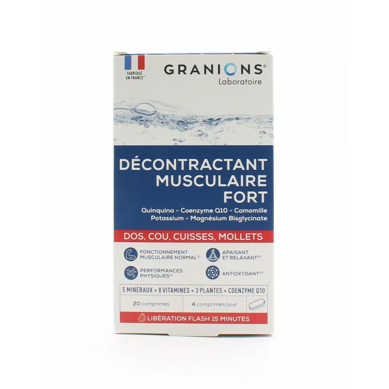 Как использовать сильный миорелаксант Granions Принимайте 4 таблетки утром или 2 таблетки утром и 2 таблетки вечером, запивая стаканом воды, желательно между приемами пищи.