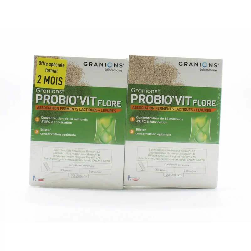 *КОЕ: колониеобразующие единицы. Наполнитель: картофельный крахмал, дрожжи: Saccharomyces cerevisiae boulardii, молочнокислые ферменты: Bifidobacterium Longum Rosell-175, Lactobacillus Rhamnosus Rosell-11, Lactobacillus Helveticus Rosell-52 (соевое молоко (культуральная среда для штаммов)). Капсула: гидроксипропилметилцеллюлоза, антислеживатель: стеарат магния, антиоксидант: аскорбиновая кислота. Меры предосторожности при использовании. Принимайте пищевую добавку Probio’Vit Flore de Granions как часть разнообразной и сбалансированной диеты и здорового образа жизни.