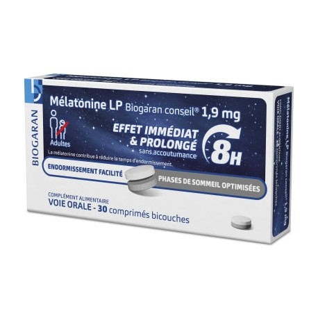 Мелатонин LP 1,9 мг от Biogaran помогает быстро сократить время, необходимое для засыпания в первой фазе сна, а затем предотвращает пробуждения, доставляя мелатонин в течение длительного периода в течение всей ночи, без привыкания, благодаря своим двухслойным таблеткам.