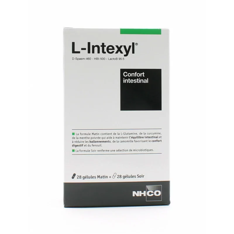В остальные недели принимайте 1 зеленую капсулу утром и две белые капсулы вечером. Состав: зеленые капсулы GreenCaps™: L-глютамин, экстракт листьев мяты перечной (Menthapiperita L.), экстракт цветков ромашки (Matricaria chamomilla L.), экстракт семян фенхеля (Foeniculum vulgare), куркумин, извлеченный из корней куркумы (Curcuma longa), цинк. бисглицинат, корень дягиля (Angelicaarchangelica). Антислеживатели: стеарат магния и диоксид кремния. Капсула: гидроксипропилметилцеллюлоза, краситель: Е141. Белые капсулы DR-Caps™: комбинация штаммов Lactobacillus Casei, Bifidobacterium infantis, Bifidobacterium bifidum и Bifidobacterium Lactis C.I.B.L 25, комбинация Lactobacillus rhamnosus и Lactobacillus acidophilus (соя) LactoB 95:5TM, наполнитель: микрокристаллическая целлюлоза, антиагломераты: Стеарат магния и диоксид кремния. Капсула: гидроксипропилметилцеллюлоза, краситель: диоксид титана. Для 2 утренних капсул (зеленые капсулы): Комплекс HBI-500™ 336 мг: L-глутамин, цинк (в форме бисглицината), 100% рекомендованная суточная норма, куркумин, извлеченный из Curcuma longa. — Комплекс D-Spasm-460™ 491 мг: экстракт Mentha Piperita, титрованный эфирным маслом (4:1), экстракт Foeniculum vulgare, титрованный эфирным маслом (7:1), экстракт ромашки ромашки (4:1), Анжелики архангельской. По 2 капсулы вечером (белые капсулы) более 20 миллиардов КОЕ/день: C.I.B.L 25™ 360 мг: Lactobacillus casei, Bifidobacterium infantis, Bifidobacterium bifidum и Bifidobacterium Lactis. — Lacto B95:5™ 300 мг: Lactobacillus rhamnosus и Lactobacillus acidophilus. 1487 мг на капсулу. Меры предосторожности при применении. Как и любую пищевую добавку, NHCO L-Intexyl следует употреблять в рамках разнообразной и сбалансированной диеты и здорового образа жизни. Не употребляйте NHCO L-Intexyl, если у вас аллергия на какой-либо из его компонентов. не превышайте рекомендуемую дозу. Не оставляйте NHCO L-Intexyl в местах, доступных для маленьких детей.
