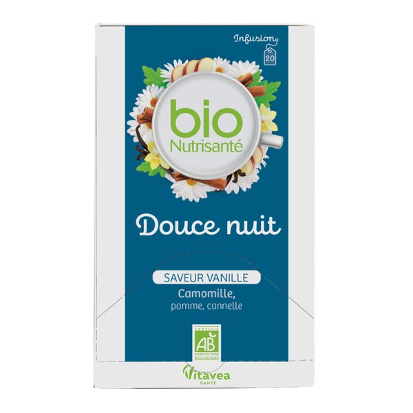 Чайный настой Nutrisanté Organic Sweet Dreams в пакетиках приготовлен исключительно из ингредиентов органического земледелия, что позволяет вам чувствовать себя хорошо благодаря полезным ингредиентам. Этот органический настой Sweet Dreams от Nutrisanté содержит ромашку, растение, хорошо известное в фитотерапии своими многочисленными полезными свойствами. Ромашка способствует расслаблению и облегчает сон. Для создания сладкого, изысканного и неотразимого вкуса компания Organic Nutrisanté добавила в рецепт яблоко, корицу и ваниль. Это сочетание вкусов является источником удовольствия, расслабления и спокойствия.