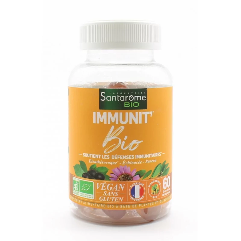 Пищевая добавка Immunit’ Bio Santarbre в форме жевательных конфет со вкусом грейпфрута является 100% органической, веганской и не содержит глютена. Рекомендации по применению Каждое утро принимайте 2 жевательные конфеты Immunit’ Bio Santarbre. СоставОрганический глюкозный сироп** — Органический тростниковый сахар. ** — сухой экстракт корня элеутерококка Organic** (Eleutherococcus sendicosus Rupr. et Maxim.) — желирующий агент: пектин — подкислитель: лимонная кислота — глицеринированный мацерат почек ольхи Organic** (Alnus Glutinosa (L.) Gaertn.), глицериновый мацерат органических почек черной смородины** (Ribes nigrum L.), глицериновый мацерат молодых органических побегов шиповника (Rosa canina L.) — натуральный ароматизатор грейпфрута — сухой экстракт корня органической эхинацеи пурпурной** (Echinacea purpurea (L.) Moench ) – концентрированный органический порошок сока бузины** (Sambucus nigra L.) – органический концентрат моркови** и органическое яблоко** – свекольный концентрат Organic red** и Organic carrot** – покрывающий агент: органический карнаубский воск**