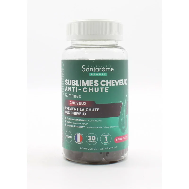 Описание Santarome Sublimes против выпадения волос.Santarome Sublimes против выпадения волос — это пищевая добавка на основе: витаминов и минералов, таких как витамин B3, B6, B8 и цинк, Venus Hair, растения, которое помогает предотвратить выпадение волос, комплекса ESSENTIA, союз ароматерапии (эфирное масло герани) и геммотерапии (три бутона черной смородины, белого вяза и дуба).
