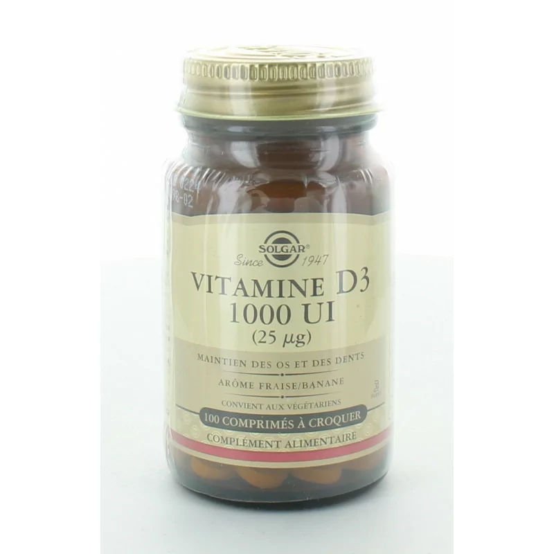 Таблетки Solgar Витамин D3 1000 МЕ со вкусом клубники/банана. Рекомендации по применению Один раз в день во время еды разжевывайте 1 таблетку. Состав 1 таблетки: