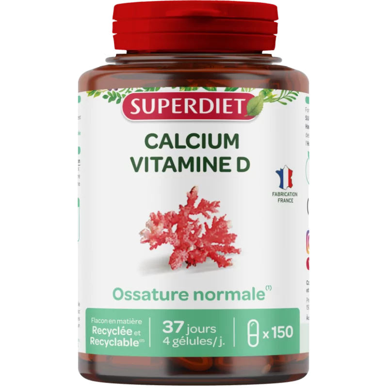 Каков состав Superdiet Кальций Витамин D? Литотамн (таллом) — Капсула из рыбного желатина — Рисовый крахмал — Наполнитель: целлюлоза — Витамин D (поддерживающие вещества: сахароза, кукурузный крахмал, жирные кислоты со средней длиной цепи, камедь акации — Антиоксидант: DL-альфа-токоферол) Для 1 капсулы:
