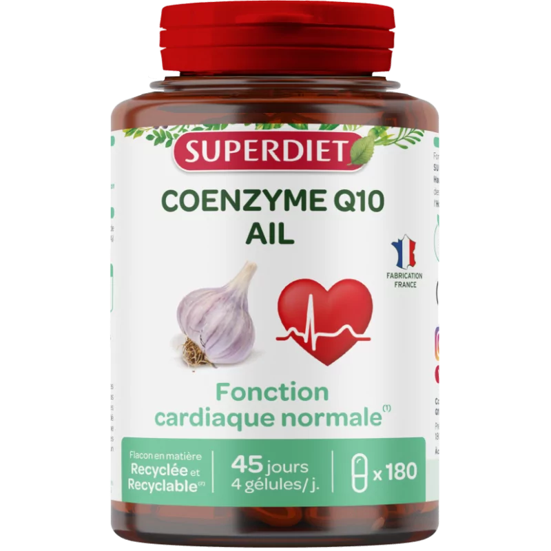 Описание чеснока с коэнзимом Q10 Superdiet Чеснок с коэнзимом Q10 Superdiet способствует нормальной работе сердца. Коэнзим Q10 – это вещество, которое естественным образом присутствует во всех клетках организма. Он также носит название убихинон (вездесущность = вездесущность). Это мощный антиоксидант, необходимый для производства энергии организмом человека. Употребление 120 мг чеснока в день способствует нормальной работе сердца. Сделано во Франции.