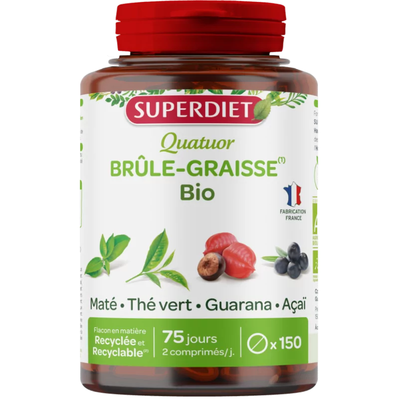 Описание органического сжигателя жира Superdiet Quatuor Органический сжигатель жира Superdiet Quatuor дает вам заряд энергии во время диеты, сочетая вместе 4 растения: Мате известен своим жиросжигающим и мочегонным действием. Гуарана также способствует жиросжигающему действию. Известно, что зеленый чай помогают сохранить фигуру и помогают избавиться от воды. Эту формулу дополняет асаи, красная ягода, богатая антиоксидантами.