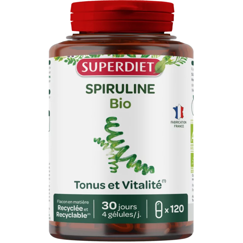 Описание органической спирулины Superdiet Органическая спирулина Superdiet богата спирулиной. Эти зеленые водоросли способствуют тонусу и жизненной силе, их можно использовать в случае временной усталости. Он поддерживает естественную защиту и повышает сопротивляемость организма. Богатый белками, рекомендуется для восстановления мышц спортсменам. Это также способствует контролю веса и уменьшает чувство голода. Это также помогает поддерживать нормальный уровень сахара в крови.