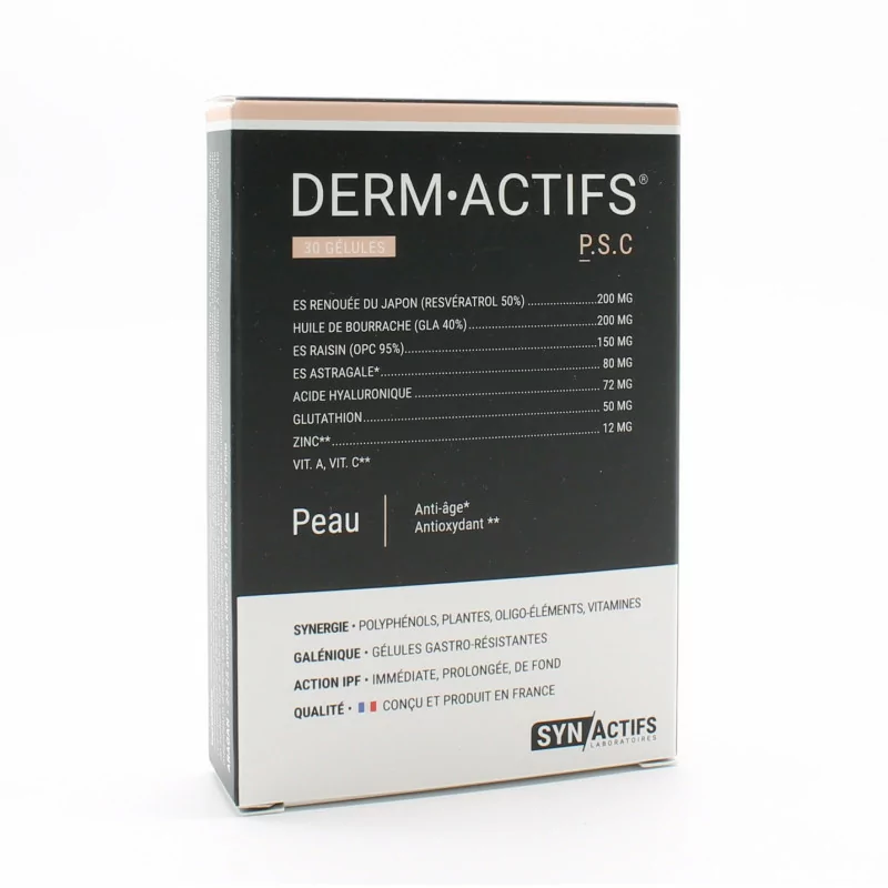 ОписаниеSynactifs DermActifs — это пищевая добавка, в состав которой входят полифенолы, жирные кислоты, биофлавоноиды, микроэлементы, трипептиды, экстракты сухих растений и витамины. Это антивозрастное и антиоксидантное средство. Способ применения Принимать по 1–2 капсулы в день перед сном. Состав: спорыш японский (ресвератрол 50%) (400/1): 200 мг.