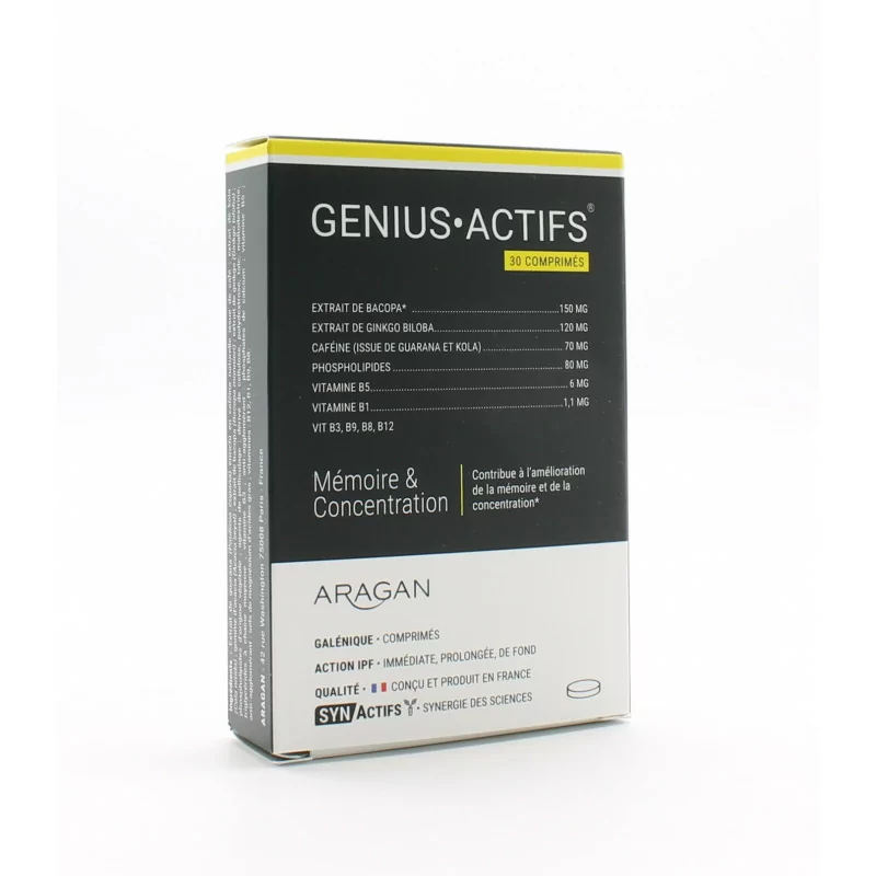 Экстракт гуараны (Paullinia cupana, обогащенный натуральным кофеином из кофе); экстракт колы (cola nitida); камедь акации (acacia seyal); экстракт бакопы (bacopa monnieri); экстракт гинкго (гинкго двулопастный); фосфолипиды растительного происхождения; покрывающие агенты: производное целлюлозы, полидекстроза, тальк, мальтодекстрин, триглицериды со средней длиной цепи; витамин В3; антислеживатель: фосфаты кальция; витамин В5; антислеживатель: магниевые соли жирных кислот; витамины: B12, B1, B9, B8. Меры предосторожности при использовании GeniusActifs от SynActifs в рамках разнообразного и сбалансированного питания и здорового образа жизни.