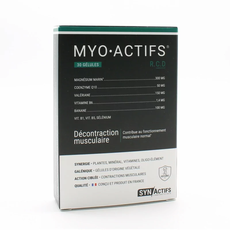 *AR: Эталонная норма потребления морского магния; антислеживатель: карбонат магния; сухой экстракт корня валерианы (Valeriana officinalis); банановый порошок (Musa x paradisiaca); коэнзим Q10 (убихинон); мальтодекстрин; селенометионин; витамин В5; антислеживатель: тальк; витамин В1; капсула растительного происхождения (полученная из целлюлозы). Меры предосторожности при использовании. Как и все пищевые добавки, принимайте MyoActifs Muscular Relaxation от SynActifs как часть разнообразной и сбалансированной диеты и здорового образа жизни.