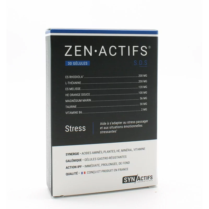 ОписаниеSynActifs ZenActifs — пищевая добавка, рекомендуемая людям, склонным к стрессу. Помогает адаптироваться к стрессовым эмоциональным ситуациям и временному стрессу.SynActifs ZenActifs способствует нормальному функционированию нервной системы, нормализации психологических функций и снижению утомляемости.Советы по применениюПринимайте по 1 упаковке. до 2 капсул в день SynActifs ZenActifs.СоставНа 2 капсулы: сухой экстракт родиолы: 200 мг, L-теанин: 200 мг, сухой экстракт мелиссы лекарственной: 120 мг, микрокапсулированное эфирное масло сладкого апельсина: 100 мг, морской магний: 56 мг (15% AR*) ), Таурин: 30 мг, Витамин B6: 2 мг (142% AR*).*Рекомендуемые дозы Меры предосторожности при использовании SynActifs ZenActifs — это пищевая добавка, которую следует употреблять в рамках здорового образа жизни и разнообразной и сбалансированной диеты. Храните SynActifs ZenActifs в недоступном для людей месте. в глазах детей Не превышайте рекомендуемую суточную дозу. В случае сомнений обратитесь за советом к своему лечащему врачу.
