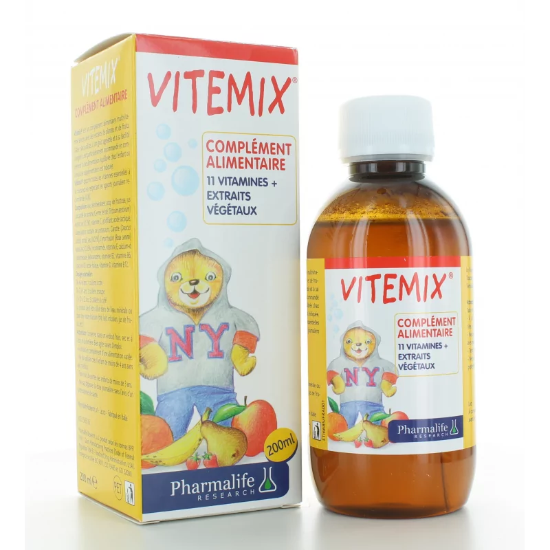 ОписаниеVitemix — это пищевая добавка на основе 11 витаминов и тщательно отобранных растительных экстрактов. Он специально разработан для обеспечения детского организма всеми питательными веществами, необходимыми для его роста. Ее приятный вкус особенно ценится молодыми людьми, поэтому эту пищевую добавку легко использовать ежедневно. Рекомендации по применению Обычная дозировка Витемикса составляет от 1 до 3 чайных ложек в день, в зависимости от возраста ребенка. От 4 до 6 лет: 1 чайная ложка. От 7 до 9 лет: 1 столовая ложка. От 10 до 12 лет: 3 чайные ложки. Также можно разбавить необходимую дозу водой или любым другим напитком (молоком, фруктовым соком, настоем…). СоставКомпонентыКоличество (на 1 чайную ложку) Рекомендуемая суточная норма*Витамин B10,40 мг36%Витамин B20,6 мг43%Витамин B60,43 мг31%Витамин B120,71 мкг28%Витамин C30 мг37,5%Витамин E5 мг42%Пантотеновая кислота2,7 мг45% Никотинамид6, 49 мг41%Бетакаротин0,75мг-Витамин D3,75мк75%Фолиевая кислота71,25мкг36%Шиповник3,75мг-Зародыши пшеницы37,5мг-Морковь3,75мг-Деминерализованная вода, сироп фруктозы, концентрированный яблочный сок, сорбат калия. *Рекомендуемые меры предосторожности при ежедневном приеме. Как и любая пищевая добавка, Vitemix не может заменить здоровое и разнообразное питание. Никогда не превышайте максимальную рекомендуемую дозу. Всегда храните эту пищевую добавку в недоступном для детей месте.