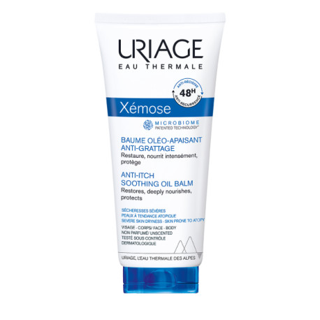 Успокаивающий масляный бальзам Xémose от Uriage питает, защищает и успокаивает зудящие ощущения, связанные с расчесыванием, благодаря патенту Chronoxine. Он обеспечивает длительный комфорт для мягкой, эластичной кожи благодаря своему тройному барьерному действию: